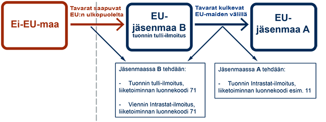 Tavarat tuodaan EU:n ulkopuolelta Suomeen ja ne tullataan täällä ja luovutetaan vapaaseen liikkeeseen.