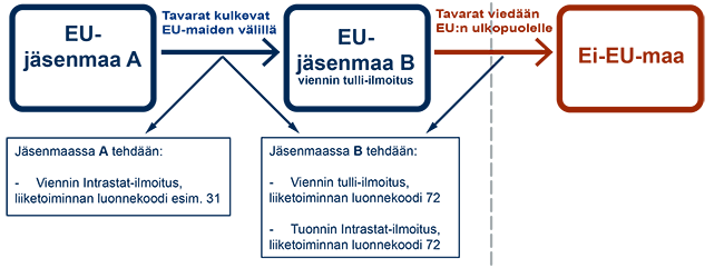 Tavarat tuodaan toisesta jäsenmaasta Suomeen ja ne asetetaan täällä vientimenettelyyn.